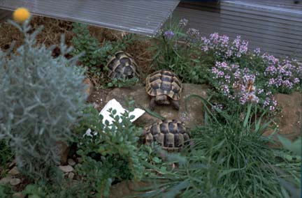 A.C.Highfield We get the calls for help all the time! "We never thought they'd hatch..... What do we do now?" Fortunately, it is not that difficult to provide a first class environment for hatchlings, of whatever species. In most cases the items required can be obtained from local sources, with the possible exception of the special lighting systems needed, which may require a visit to a specialist store, or on-line mail-order supplier. This is how we deal with new hatchlings at the Tortoise Trust. In all cases, once the hatchling is fully emerged from the egg, we remove it from the incubator and place it in a suitable container. Do note that it is perfectly normal for hatchlings to 'pip' the egg and remain there without emerging fully for quite some time. During this period they are breathing with their lungs, and are absorbing yolk sac. Do not attempt to 'force' them out of the egg. They have been hatching without human help for millions of years. It will leave when it is ready. Once out, pick it up carefully, and according to type, move to the following recommended environments: Mediterranean, Leopard, Sulcata and Desert tortoises, etc. For the basis of the accommodation, we use those plastic 'under-bed' storage trays that you can obtain from most hardware stores. These are excellent. They are relatively cheap, are light in weight, are fairly durable and are easy to clean. They come in various sizes. We use ones measuring approximately 60 cm (2 feet) by 40 cm (15 inches) X 14 cm (6 inches). This provides a good surface area and is about right for a small group of hatchlings. To this, we add a substrate comprising a 50/50 mix of soft 'play' sand and clean loam-based compost, or topsoil. This should be dry, not damp. Aim for a depth of about 6 cm or 1.25 inches. This is important, as it provides extra thermal stability for the babies, and also allows them to bury themselves for security and microclimate purposes. About 40 cm (15 inches) above this tray, slightly to one end, we position a 100 watt UV-V Heat lamp fixture. This provides excellent UV-B, UV-A and visible light output combined with radiant heat for basking. Within the tray we have some small 'huts' for shelter and a fresh, shallow water dish. That's it. No heat pads. No glass tank. No overnight heating. We keep them at normal household room temperature overnight. This might sound too easy, and too straightforward - but it works! Just how simple it is should be clear from the illustration above. Despite its incredible simplicity, and very low cost, this system outperforms every expensive commercial vivarium or terrarium we have seen or tested. Redfoot, Yellowfoot, Box, and Hingeback tortoises, etc. We use the same basic design as above, but we modify the sand and soil substrate to a 70/30 peat-type loam and soft sand combination rather than a 50/50 mix, and on top of this we lay about 25mm (1 inch) of moist sphagnum moss. The first later of substrate in this unit is also not quite as deep as for arid species - no more than 12mm (0.5 inches). Beneath one end we place a 30-watt heat pad covering approximately 50% of the total surface area. If you prefer, you can use damp paper towels as the substrate with very new hatchlings that have a large egg-sac, but although more 'hygienic' looking, it does not provide quite such an ideal environment. Juveniles do like to bury themselves, not just for a sense of security, but also to conserve fluids and to prevent dehydration. Baby box and wood turtles are especially susceptible to such problems. As always, we include a shallow water tray, extra hiding places, and a UV-Heat lamp at a distance of approximately 40 cm (15 inches). With these humid-habitat species, the prevention of dehydration is absolutely critical, so try to maintain air humidity in the 70%+ range at all times. You may find a warm-air type humidifier a great help if you live in a house or locality where air humidity levels are very low. The moist substrate as described above may not be sufficient by itself in such circumstances. General maintenance Change the UV-Heat lamp after every 2,000 hours of use. Use a calcium supplement daily. The substrate should be changed every 2-3 weeks, more often if it becomes visibly soiled. Do not place the trays containing juveniles in direct sunlight as critical overheating can occur very rapidly. If you wish to get the juveniles outside when weather permits (which is a very good idea), then construct a separate, secure outdoor pen with a natural substrate and adequate anti-predator protection. The tray systems described above are designed for indoor use only. A suitable outdoor unit for Mediterranean hatchlings is shown above. This attractive set-up was designed by Lin King in the UK. Diet is, of course, critical.