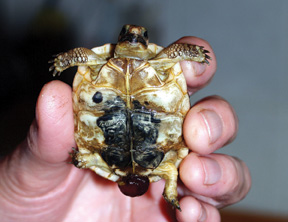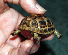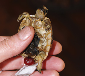 The use of table sugar can be an effective method to reduce swelling of a prolapse as a prelude to surgical replacement. The method has previously been used in sheep and cattle, and even in human medicine. Sugar is an excellent growth medium for bacteria, however, so it is imperitive for the tortoise to receive antibiotic cover to prevent infection. Any tortoise found with a prolapse should be brought to a specialist vet without delay. Do, however, protect the prolapse with plastic wrap to keep the area clean and prevent the tortoise from causing any tissue damage with its back claws. Bladder stones are often the result of dehydration, however, other metabolic conditions can also be underlying causes. A tortoise showing signs of straining or painful urination should be promptly taken to a specialist vet for diagnosis and treatment.