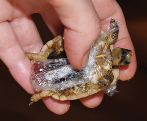 A x-ray confirmed that a bladder stone had formed, and the prolapse was the result of the tortoise straining to pass it. Unfortunately, the stone was slightly larger than the space between the pelvic bones, and could not be passed. Surgery was a very risky option with such a small tortoise, so the decision was made to begin a daily dose of allopurinal, and to simply allow the tortoise to grow to a size where it could pass the stone. This tortoise always had access to water, which it drank regularly, but several daily baths were also given to ensure adequate hydration.